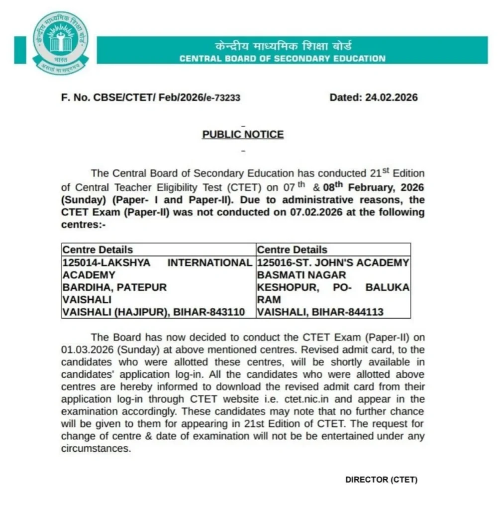 CTET Re-Exam Date Out: केंद्रीय शिक्षक पात्रता परीक्षा (CTET February 2026) से जुड़े अभ्यर्थियों के लिए अहम खबर सामने आई है। 7 फरवरी 2026 को आयोजित परीक्षा के दौरान कुछ केंद्रों पर पेपर नहीं हो सका था। अब Central Board of Secondary Education ने सार्वजनिक नोटिस जारी कर नई परीक्षा तिथि घोषित कर दी है। यह री-एग्जाम (Re-Exam) केवल उन्हीं उम्मीदवारों के लिए होगा जिनका पेपर रद्द हुआ था।