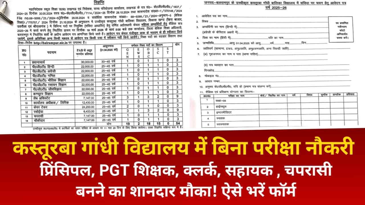 KGBV Teaching Non Teaching Application 2026 : उत्तर प्रदेश में सरकारी नौकरी की तैयारी कर रहीं महिलाओं के लिए बड़ी खुशखबरी सामने आई है। कस्तूरबा गांधी बालिका विद्यालय (KGBV) ने वर्ष 2026 के लिए नई भर्ती का नोटिफिकेशन जारी कर दिया है। इस भर्ती अभियान के तहत शिक्षण (Teaching) और गैर-शिक्षण (Non-Teaching) दोनों तरह के पदों पर नियुक्तियां की जाएंगी। खास बात यह है कि यह अवसर सिर्फ महिला अभ्यर्थियों के लिए है और आवेदन प्रक्रिया पूरी तरह ऑफलाइन रखी गई है।